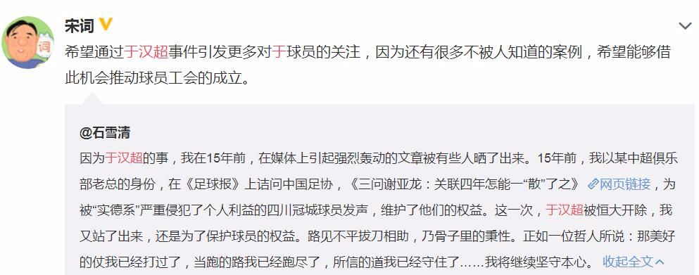 对此,名记袁野也跟进表态,"希望通过于汉超事件引发更多对于球员的关注,因为还有很多不被人知道的案例,希望能够借此机会推动球员工会的成立。"