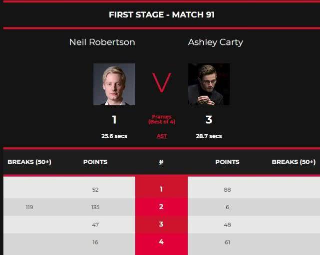 原本,罗伯逊被认为小组晋级没有任何悬念,谁知循环赛第一轮就遭当头一棒。在与世界排名第83位的卡蒂的比赛中,罗伯逊一上来52-88先丢一局。第二局尽管轰出单杆119分,并将比分扳成1-1平局。可随后两局,卡蒂在胶着的比赛中,48-47、61-16连胜两局,总比分3-1爆冷击败世界第二。