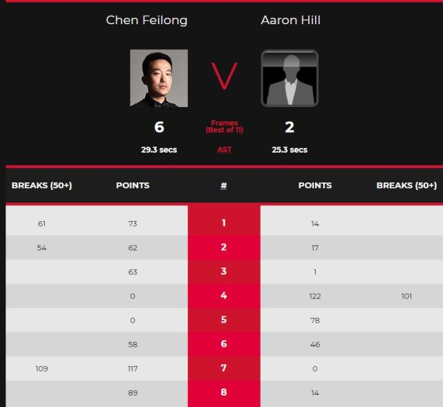 第三局,陈飞龙通过几次上手,63-1再次胜出,比分优势扩大到3-0。第四局,开局大比分落后的希尔终于打出年轻人的气势,他轰出单杆101分,122-0零封陈飞龙,3-1扳回一局。第五局,希尔再次零封陈飞龙,这一局的比分是78-0,比分追成3-2。