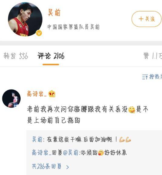 可球迷认为高诗岩的防守动作太大,对吴前下手太狠,可事实上两人之间的关系却相当不错。在比赛结束之后,高诗岩还专门与吴前在社交媒体上进行了互动,并调侃道,"老前我再次问你胳膊跟我有关系没,是不是上场前自己挠的。"