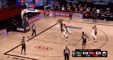 易边再战后,巴特勒第三节找到手感,先是底角顶着马修斯强投三分命中,随后借挡拆45度干拔三分再次命中,字母哥此役依然打得艰难,好在禁区内的统治力还是不错的,因此进入第四节,雄鹿依然领先。但是,第四节雄鹿开始崩盘,巴特勒反跑空接上篮得手,随后阿德巴约中路跟进隔扣字母哥,热火完成反超!