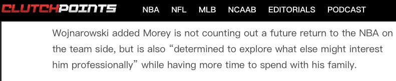 著名记者在最先的报道中补充称,莫雷并不指望将来能回到NBA球队,但他也"决心探索他职业生涯中可能感兴趣的其他方面",同时利用更多的空闲时间和家人在一起。