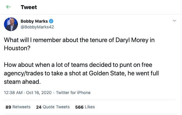 著名记者鲍比·马克斯:我对莫雷在休斯顿的最深刻印象是什么?当很多(球队交易)、球员决定奔赴金州时,他都会全力以赴。