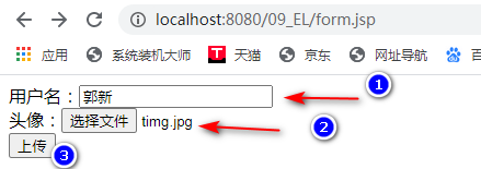 1、要有一个 form 标签,method=post 请求 2、form 标签的 encType 属性值必须为 multipart/form-data 值 3、在 form 标签中使用 input type=file 添加上传的文件 4、编写服务器代码(Servlet 程序)接收,处理上传的数据。 注:encType=multipart/form-data 表示提交的数据,以多段(每一个表单项一个数据段)的形式进行拼接,然后以二进制流的形式发送给服务器 编写form.jsp页面: