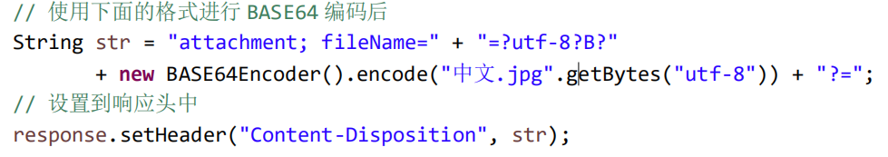 如果客户端浏览器是 IE 浏览器 或者 是谷歌浏览器。我们需要使用 URLEncoder 类先对中文名进行 UTF-8 的编码操作。 因为 IE 浏览器和谷歌浏览器收到含有编码后的字符串后会以 UTF-8 字符集进行解码显示。resp.setHeader("Content-Disposition", "attachment; filename=" + URLEncoder.encode("中国.jpg", "UTF-8"));方案二:BASE64 编解码 解决 火狐浏览器的附件中文名问题