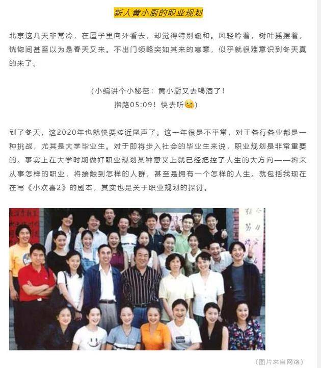 在采访中,黄磊建议即将步入社会的毕业生做好职业规划,认为"在大学时期做好职业规划某种意义上就已经把控了人生的大方向——将来从事怎样的职业,将接触到怎样的人群,甚至是拥有一个怎样的人生。"黄磊还透露现在自己正在写《小欢喜2》的剧本,而这部剧"其实也是关于职业规划的探讨。"