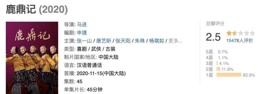 目前新版《鹿鼎记》首播,豆瓣评分跌从2.9跌至2.5,成为有史以来最低分的《鹿鼎记》。