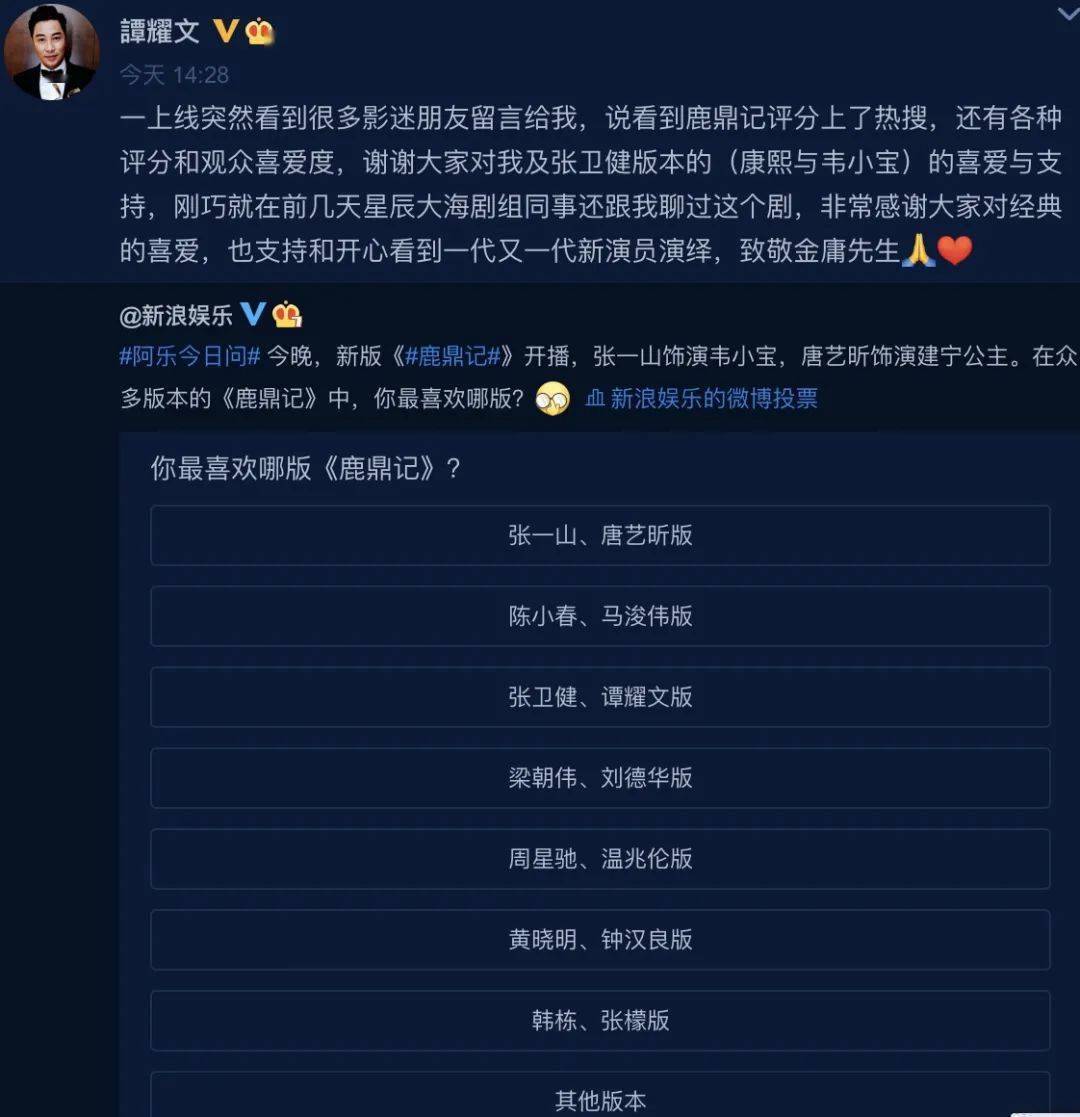 谭耀文也发文感谢大家对他和张卫健版本的喜爱与支持,"非常感谢大家对经典的喜爱,也支持和开心看到一代又一代新演员演绎,致敬金庸先生"。