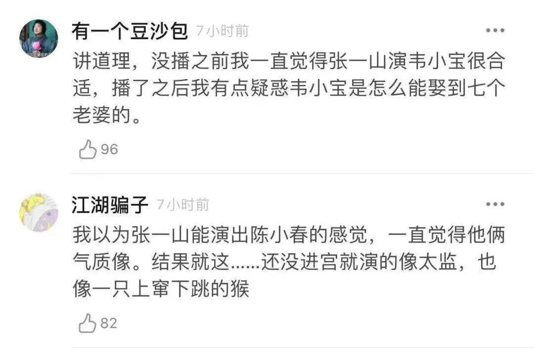 也有观众反映,看完之后发现张一山演得像太监,有点疑惑韦小宝是怎么娶到7个老婆的。