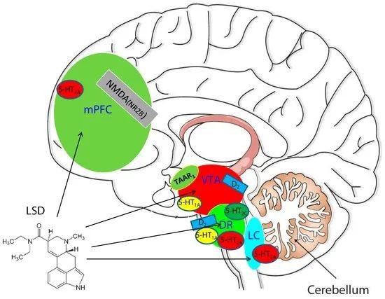 图2 LSD作用于广泛的脑区(Danilo De Gregorio et al。 2016)