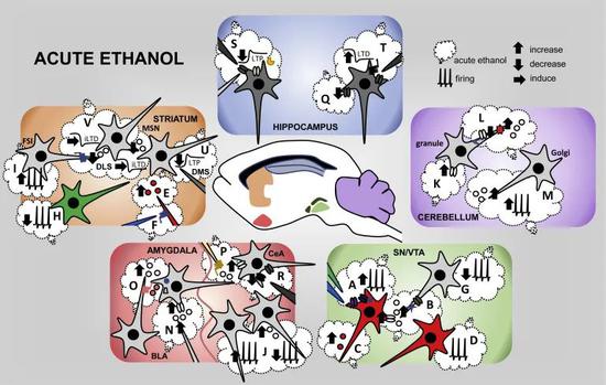 图3 酒精急性作用的广泛中枢系统靶点(Abrahao, K。 P et al。 2017)