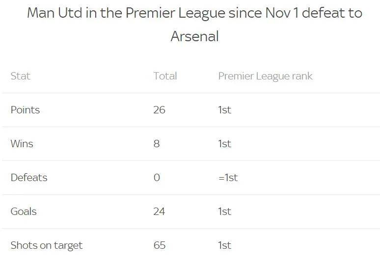 数据显示,自从输给阿森纳后,曼联在英超中的积分、胜场、进球和射正数据,均排在联赛第一。