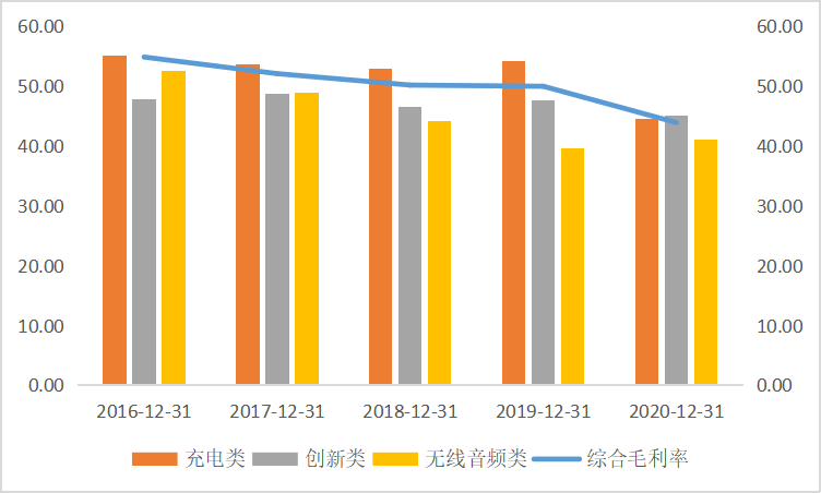 导致毛利率下滑的其中一个因素就在于新品类快速扩张带来的稀释效应。新业务的开展、新品类的开拓需要相应的人员、技术和资金支持,在产品开发早期无疑会增加企业负担,削弱盈利能力。从安克创新三大产品详细的毛利率情况来看,其中,充电类产品仍然是企业最稳定、最挣钱的部分,创新类产品和无线音频类产品的毛利率均弱于充电品类,2020年创新类产品毛利开始出现改善,而无线音频类产品毛利仍然在41.1%,低于公司综合毛利率的43.9%。