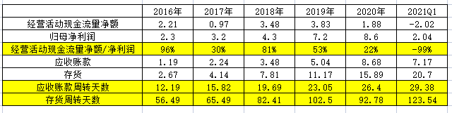存货风险在上升。根据财报披露信息,近5年来,公司的归母净利润呈上升趋势,但经营活动产生的现金流量净额却没有随之稳步增长,净现比持续降低。2020年公司归母净利润为8.6亿元,同期经营活动产生的现金流量净额只有1.9亿,净现比为22%,2021年1季度这一比率甚至降至-0.99%,公司净利润的含金量持续下滑。