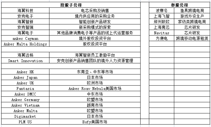 其中,安克智瑞、安克电子、海翼科技三家公司是针对公司的主营产品做原材料、电芯采购及销售业务,海翼智新则是公司旗下的智能创新产品研发平台;而另外3家子公司则涉及到了公司下一步新的业务布局。其中,海翼电子主要是为其他出海平台提供线上代运营服务,而Anker Cayman和Anker Malta Holding则为公司境外股权投资平台,对接海外创业公司,做消费电子品牌的孵化。与此同时,2020年6月公司宣布了"创业者"集结计划,目的也是为出海智能硬件创业者提供全价值链的赋能平台。