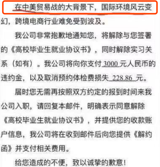 还有一份网上流传的截图,6月24日,某超级大卖向已录用的高校毕业生发出解除就业协议书,并支付违约金和取消预约体检费。