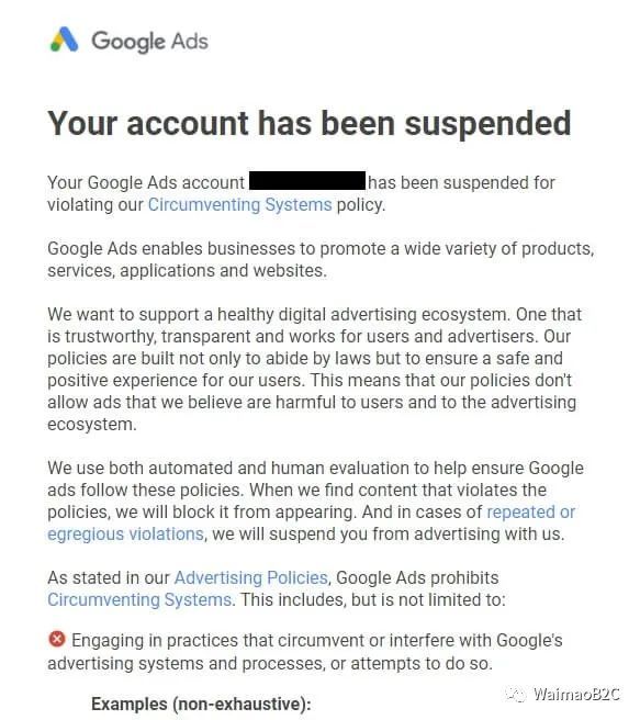 昨天周末,本来挺开心的,却被来自谷歌的一封通知邮件给搞坏掉了。谷歌广告账户又双叒叕因为违反了相关的政策被暂时停用了。