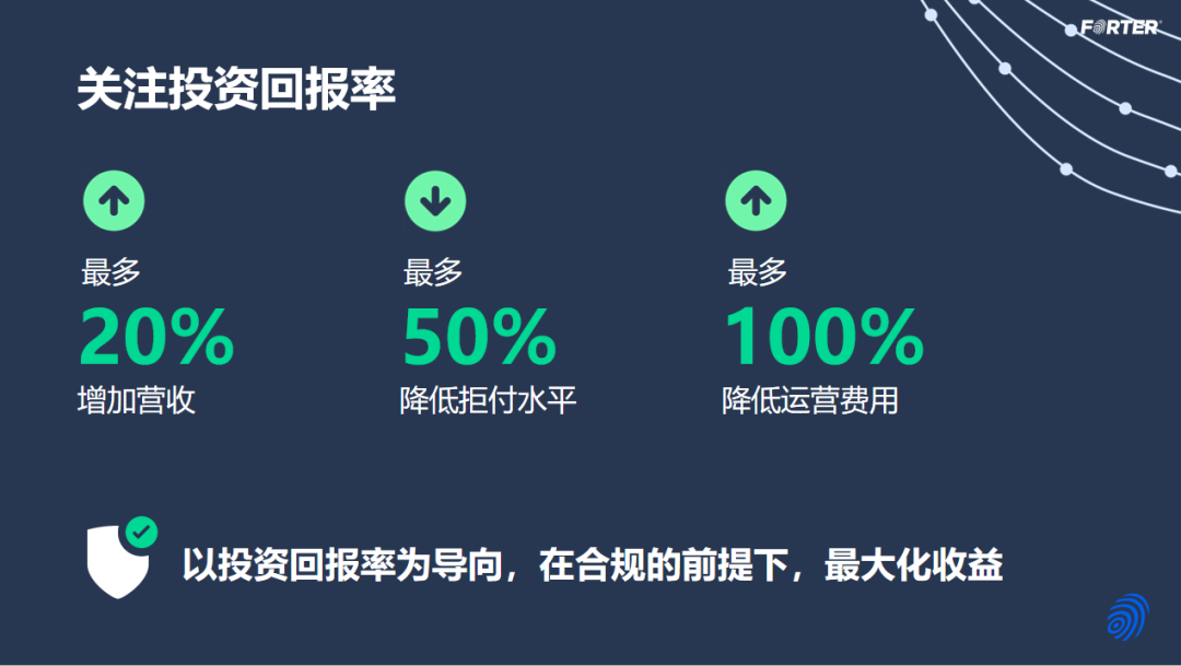 顺应时代和技术的发展,出海数字化产品该如何构建风控体系的呢?基于传统风控手段中出现的痛点,过百隆提出"以投资回报率为导向,在合规的前提下最大化收益率"。