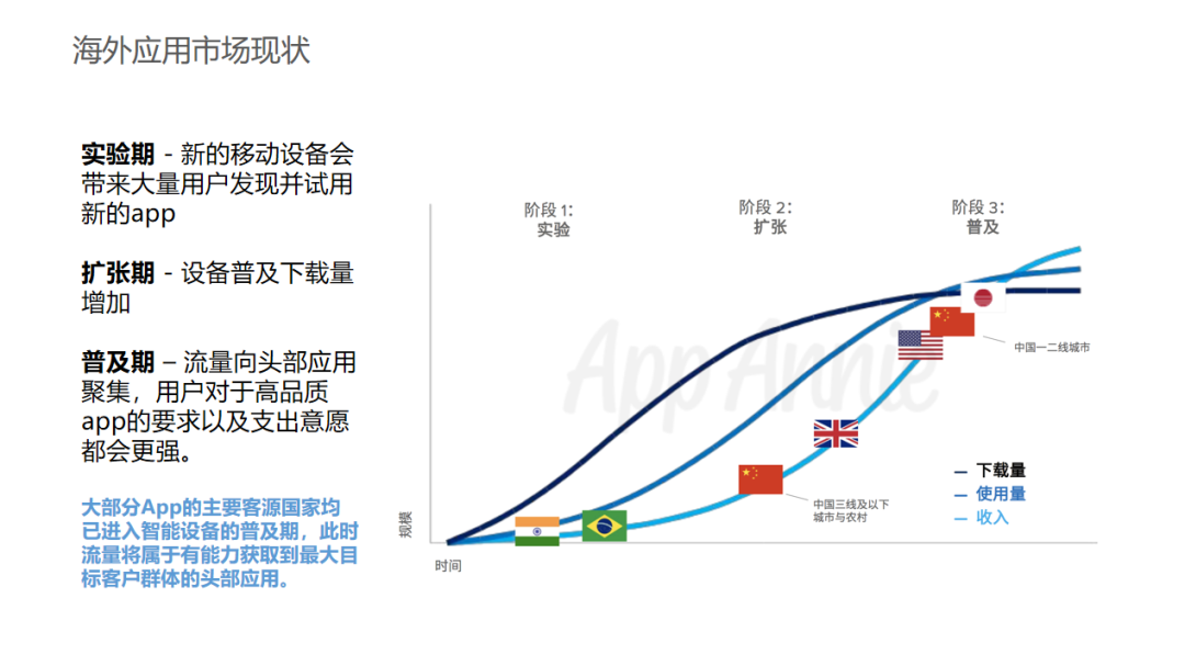 根据智能设备的渗透率,整个移动 APP 市场分为三个主要的阶段,分别是试验期、扩张期、普及期。针对不同地区的发展阶段,出海企业可以选择更适合自己发展的市场。例如巴西、东南亚等地区,还属于早期扩张期阶段,这种情况下很多品类的竞争不激烈,出海企业可以更好地去养成用户订阅习惯。