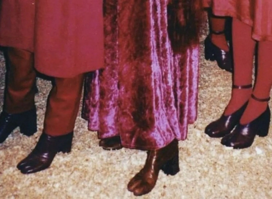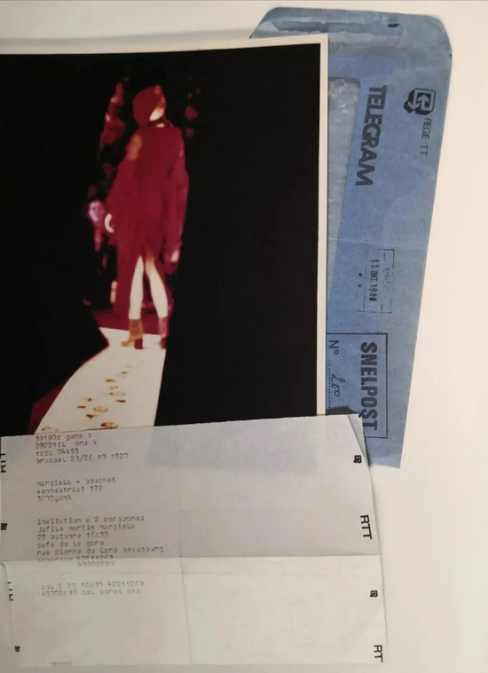 1989春夏女装秀的电报邀请函,模特穿着沾有红色墨水的 Tabi 鞋,在秀场的白布上留下了红色印记。