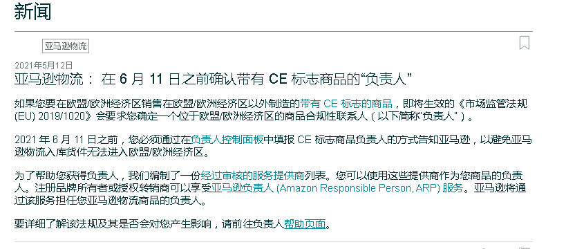 亚马逊早在2021年5月12日已经发布新闻公告,需要在2021年6月11日之前确认带有CE标志商品的负责人。这个负责人就是欧代。