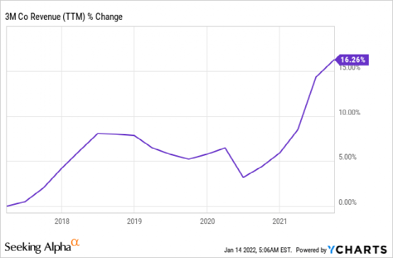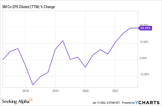 在过去五年中,收入一直在缓慢增长。3M 的年增长率为 3%,是一个稳定的慢动作者。它的大部分增长是有机的,因为该公司不时收购业务以补充其当前的产品。根据分析师对 Seeking Alpha 公司概况的共识,投资者应预期中期内的年收入增长将低于个位数。