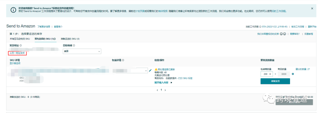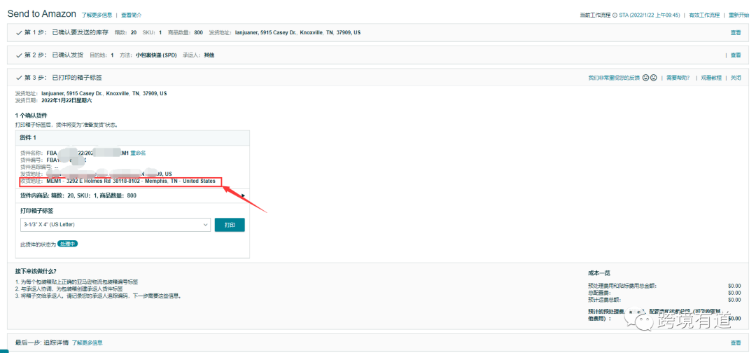 第四步,按照新的发货地址进行发货,点击确认发货步骤,不断测试修改前面的地址,直到最后生成的FBA仓库地址变成你所想要的那个地址为止。