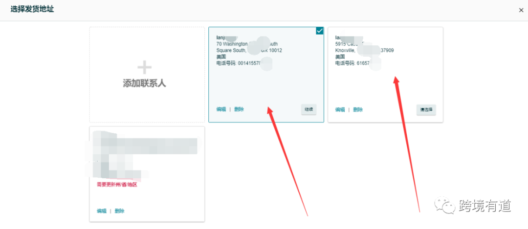 第三步,找到合适的美国地址和美国电话号码之后,更新到发货地址上,并选择新的发货地址进行发货: