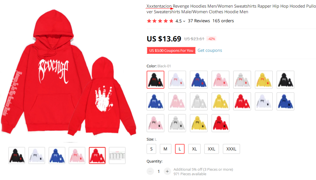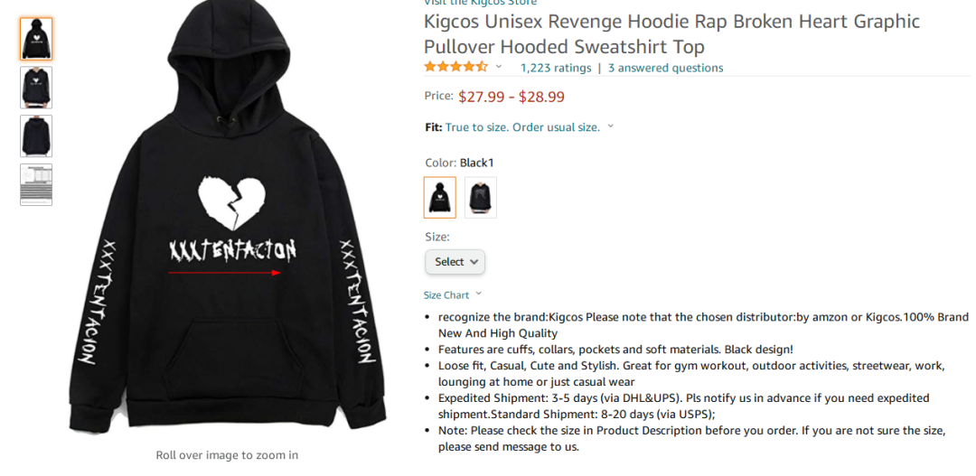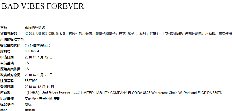 名下的注册商标有XXXTentacion、Bad Vibes Forever,主要注册类别为25类服装鞋帽类和09,41类音乐音频和视频、现场音乐表演类。产品标题和图片上出现以上商标都属于侵权,尽快自查下架。