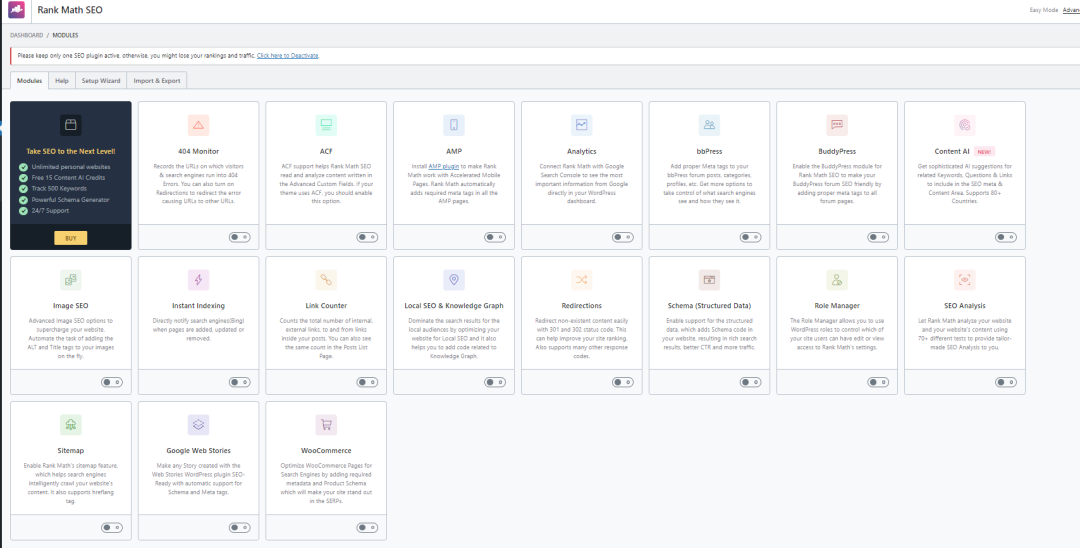 rank math功能很多很全,需要的就可以打开,不需要的直接关闭
