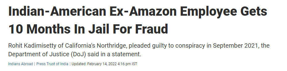 这个叫Rohit Kadimisetty的28岁印度裔员工和其他六名亚马逊现任或前任员工,在去年9月份被警方逮捕并正式起诉,经过漫长审问和举证的过程后,年初该员工已经承认所犯罪行,并且最终以参与国际贿赂计划窃取机密信息等罪名判决。