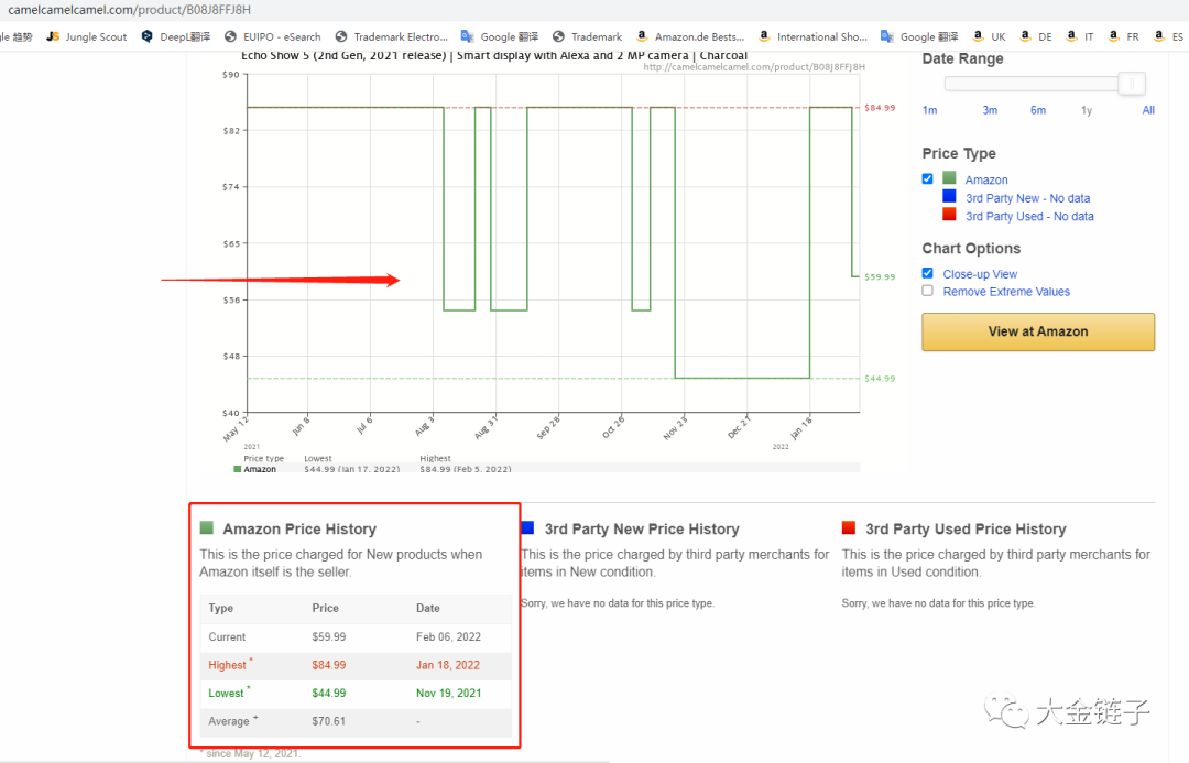 Keepa与CamelCamelCamel相当相似,主要区别在于你可以选择查看产品历史的时间框架。这个倾向于给你一个更直接的观点,而不是CCC的更长期的观点。