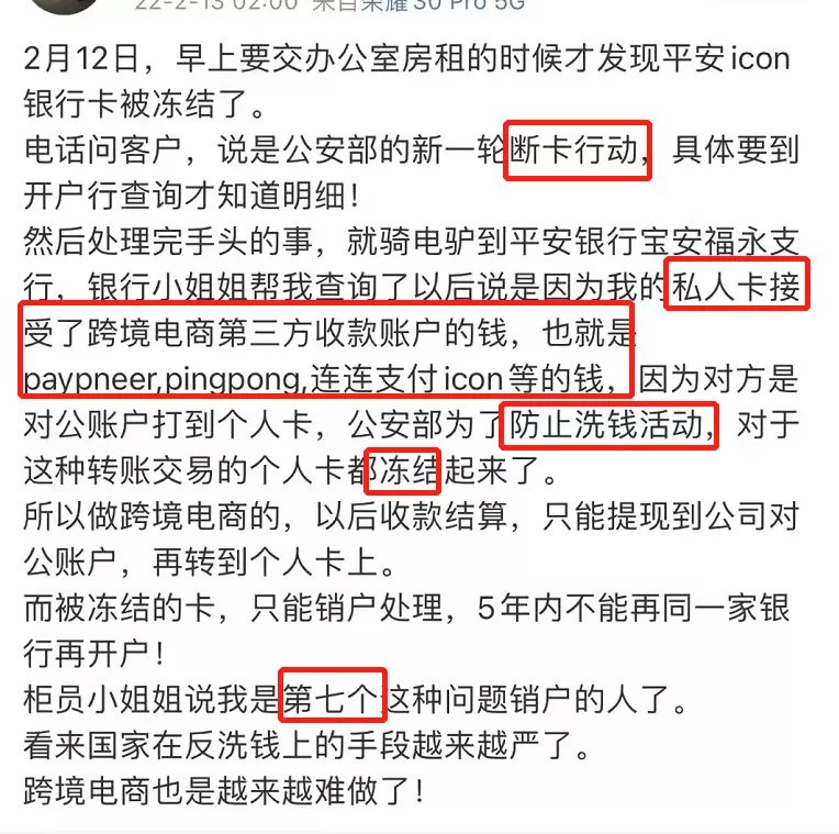 放眼近段时间,跨境行业逃税、诈骗等乱象屡屡发生,部分跨境公司利用违规手段逃避缴税,甚至获取非法收入。在此境况下有关部门的监管也愈渐收紧。 AMZ123了解到,近日公安部开展了新一轮断卡行动,矛头直指非法洗钱。 一位Shopee卖家在微博上爆料其一张平安icon银行卡莫名遭到冻结,经银行工作人员的查询,原因系其私人卡接收了来自跨境电商第三方收款账户的资金汇入,即Payoneer、Pingpong、连连支付icon等跨境收款平台。