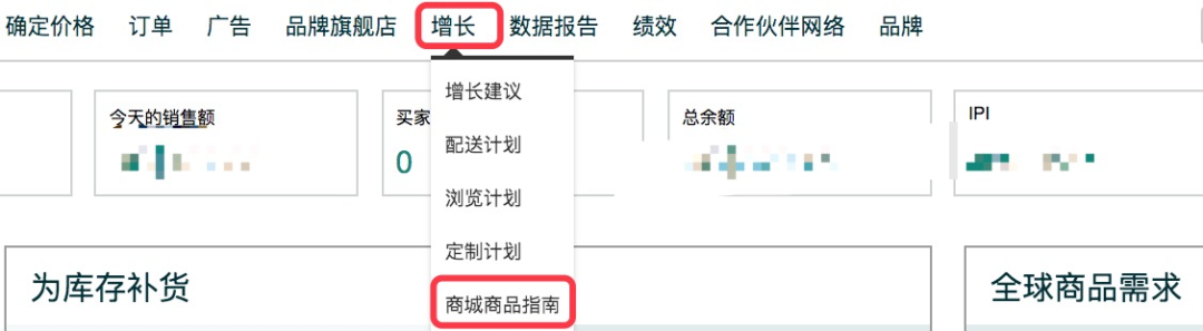 1.登陆亚马逊后台,点击菜单"增长"----"商城商品指南"