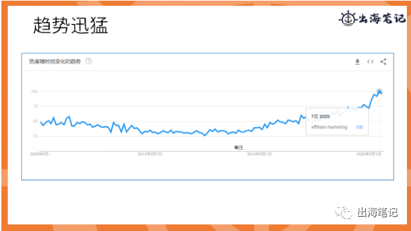 因为在2020年的七月份,人们营销的搜索量甚至是会达到了11年来的首次的最高峰,而且这五年间,它的联盟营销排名也是从全球的25位上升到了100位。那这里的话,100其实就是峰值是很高的,你看它从来都是在50以上。因为我以前其实也有像产品开发的同事有了解过,就是说热度在50%以上的,这个指数在50以上的话,那其实已经算是比较热门的了。