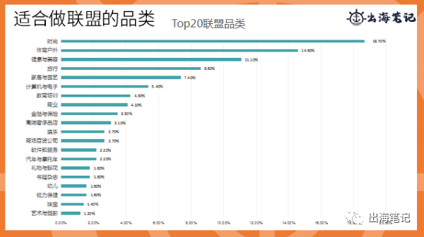 那我又觉得这个是不一定的,因为其实不是所有的产品都适合做联盟营销。我这里这个数据也是在网上搜下来的,就是top20类的联盟品类,有从时尚到艺术摄影 确实来说最高的最适合做联盟的就是时尚类了,它大约是占18% 可以说是联盟推广的宠儿。