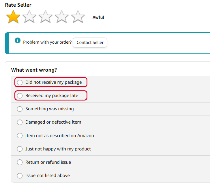 当买家进行负面评论反馈的时候选择了【Did Not Receive Package】或者【Received Package Late】,该反馈将被系统自动删除。