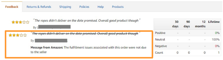 该反馈将不会影响您的订单缺陷率(ODR),且此买家的评论会显示有删除线和以下声明:"与此订单相关的配送问题不是因卖家而起"。