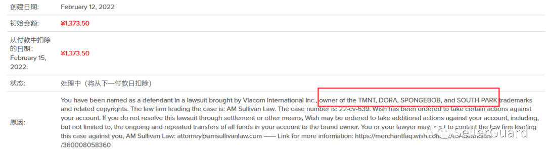 据Wish买家收到的一则冻结消息提示,DORA(朵拉),SPONGEBOB(海绵宝宝),SOUTH PARK(南方公园)这三个动画片也都被AMS律所隐匿代理了!目前海绵宝宝卖家已收到货款冻结通知: