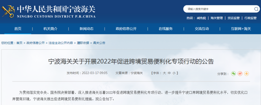 从宁波海关获悉,为贯彻落实党中央、国务院决策部署,深入推进海关总署2022年促进跨境贸易便利化专项行动,进一步提升宁波口岸跨境贸易便利化水平,切实优化口岸营商环境,宁波海关推出促进跨境贸易便利化措施。现公告如下: