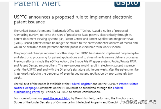 2021年12月16日,美国专利商标局(USPTO)局长Drew Hirshfeld在自己博客上发文,表示美国将在2022年过渡到以电子方式发放专利和商标证书,美国专利商标局不再印发纸质版证书。根据现在的规则,美国专利商标局修改实践规则中以电子方式颁发专利证书建议,必须"颁发专利证书时向记录的通信地址交付或邮寄"。也就是说明年卖家如果注册美国专利,美国方不再通过邮寄通信地.............