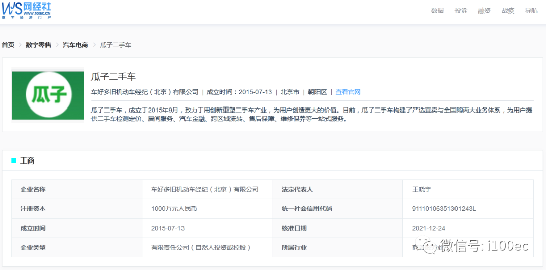 网经社企业库(COP.100EC.CN)显示,瓜子二手车隶属于北京车好多旧机动车经纪(北京)有限公司,该公司成立于2015年7月,法定代表人为王晓宇。瓜子二手车自称构建了严选直卖与全国购两大业务体系,为用户提供二手车检测定价、居间服务、汽车金融、跨区域流转、售后保障、维修保养等一站式服务。