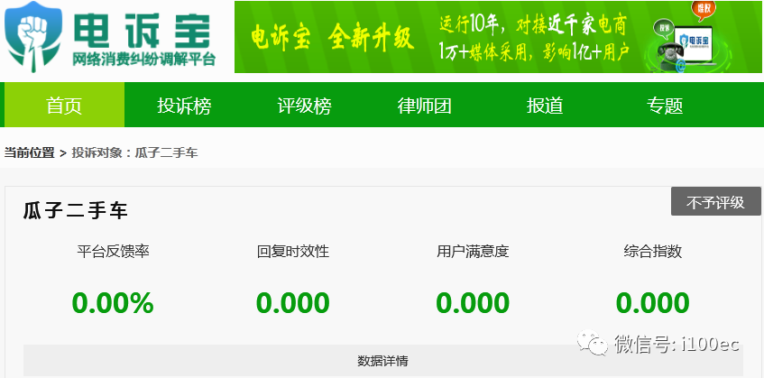 截止2021年,根据"电诉宝"受理的数字零售(汽车电商)领域用户有效投诉显示(依据投诉量排行),瓜子二手车排名第5位。最新评级为"不予评级"。