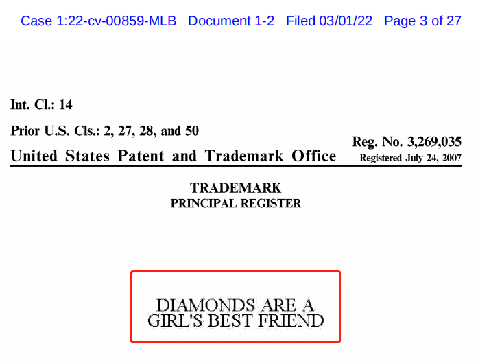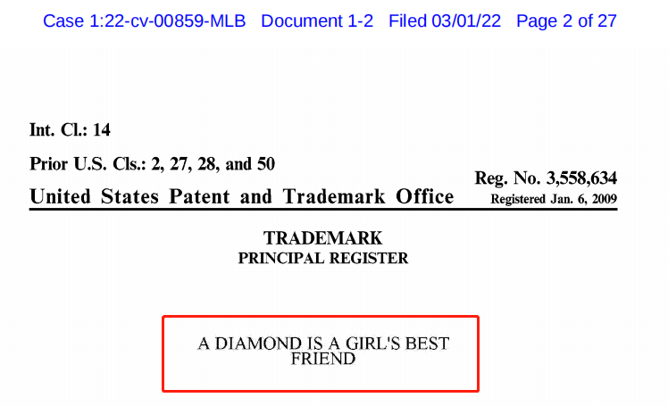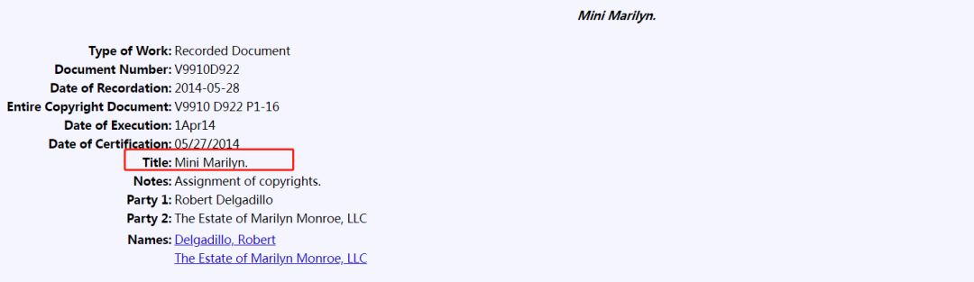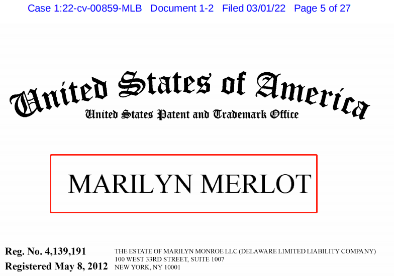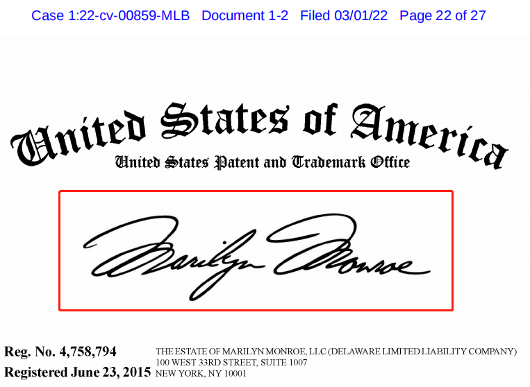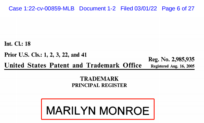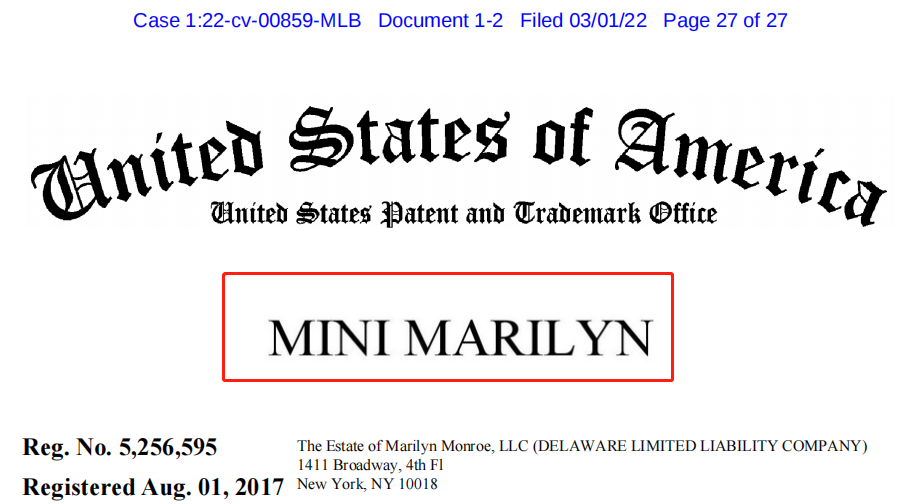 本次并不是MARILYN 第一次发起侵权起诉,权利人THE ESTATE OF MARILYN MONROE LLC的最新起诉在22年3月1号发起,案件编号22-cv-859。