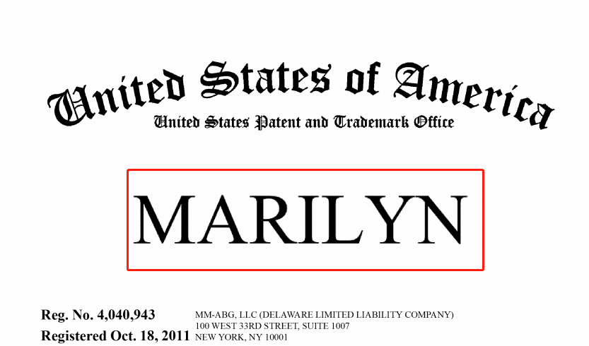 侵权商标为:MARILYN、MARILYN MONROE、 DIAMONDS ARE A GIRL'S BEST FRIEND等文字商标。