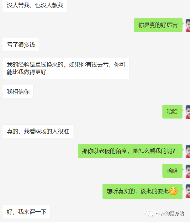 女神说她的经验都是亏钱亏出来的并相信如果我有资金去亏也能亏出一个模样, 接着女神的"看职场人很准"也让她站在老板角度来帮我作一个客观评价.