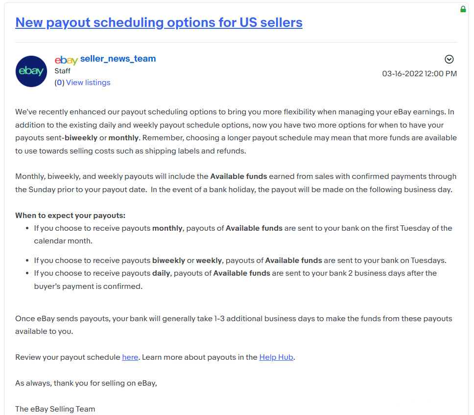 日前,eBay美国站宣布为其托管支付服务新增两种付款期限。除了现有的日付和周付选择以外,卖家还可以选择两周一次或每月一次。eBay表示,选择更长的付款期限意味着有更充足的资金可用于支付运输标签和退款等销售成本。据悉, 周付、月付和两周付将将包括销售额中的可用资金,卖家还需要在每个付款日期的上一个周末之前确认付款。若银行放假,款项将在下一个工作日发放。
