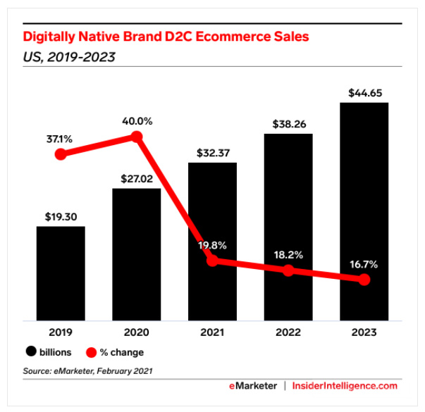 飙升的数字广告成本、运输成本、Apple的iOS隐私变化以及小于预期的客户群(疫情导致的消费者购买行为转变)正在为许多DTC数字原生品牌创造一个充满挑战的市场环境。据eMarketer估计,数字原生品牌今年的美国DTC电商销售额增长将放缓至18.2%,较两年前的40.0%显着下降。