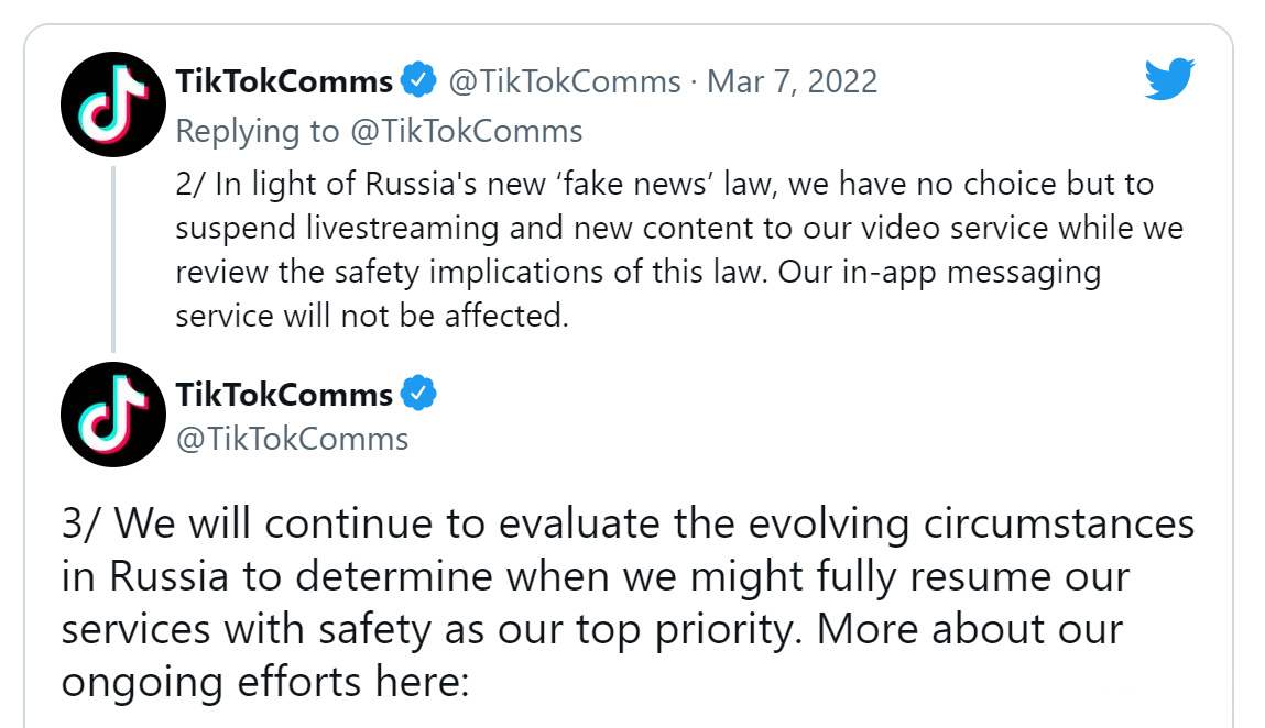 AMZ123获悉,3月6日TikTok宣布暂停俄罗斯用户的直播和新内容发布功能。TikTok在Twitter的官方账户表示:"鉴于俄罗斯推出新的"假新闻"法,我们别无选择,只能暂停我们视频服务的直播和新内容上传功能,同时审查用户所发内容。但用户能正常使用互发消息的功能。"