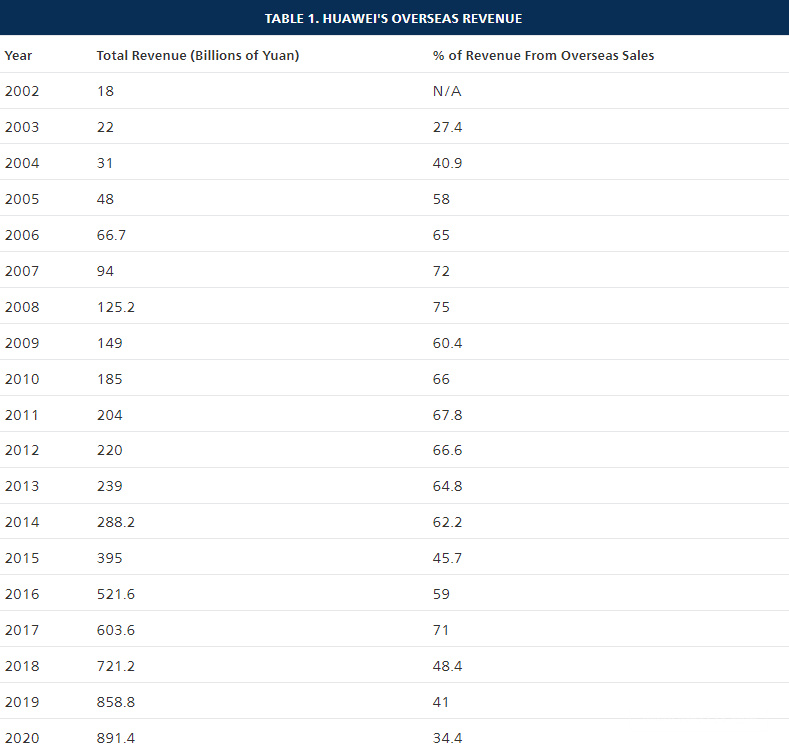 华为进军全球的第一步,是在进入高收入市场之前,首先向低收入和中等收入经济体扩张。这种做法反映了中国"以农村包围城市"的扩张战略。发展中国家对扩大网络容量(例如在地理覆盖范围和用户数量方面)和升级网络设备(从3G转向4G并最终转向5G)的需求不断增长,加上华为具有竞争力的价格产品,该公司很快开始就从海外市场获得比国内更多的收入。2012年,华为在营收上超越瑞典爱立信,成为全球最大的电信设备供应商。